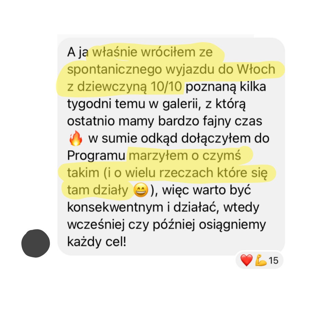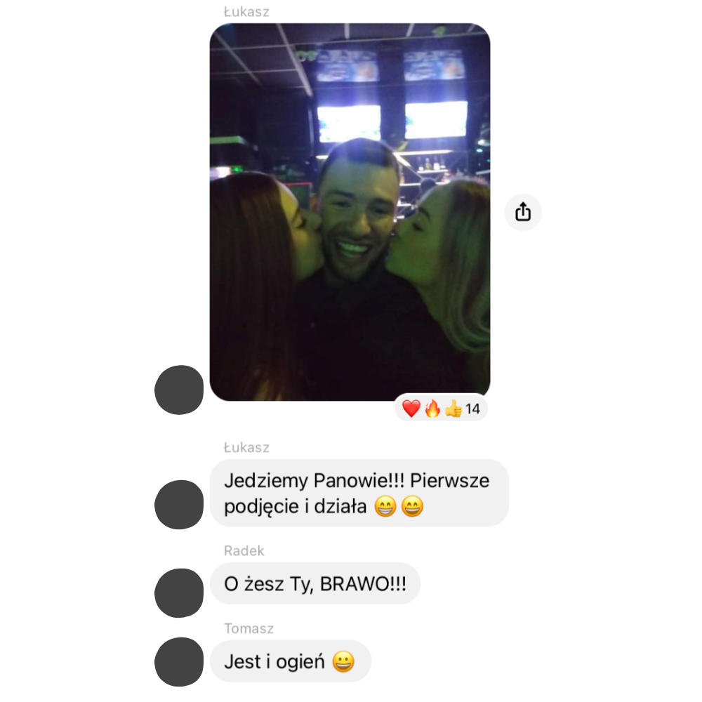 Prawdziwe opinie od mężczyzn, którzy mieli podobne problemy co Ty i skutecznie je rozwiązali. To są screeny z naszego zamkniętego, prywatnego czatu dla klientów, do którego dodamy Cię, gdy dołączysz do ekipy. Tam nasi klienci dzielą się swoimi sukcesami, zadają pytania i wspierają się nawzajem w drodze do celu.